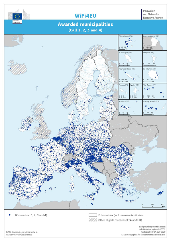 - Cities and municipalities under the WiFi4EU initiative can receive a EUR 15,000 voucher to provide free internet in public locations